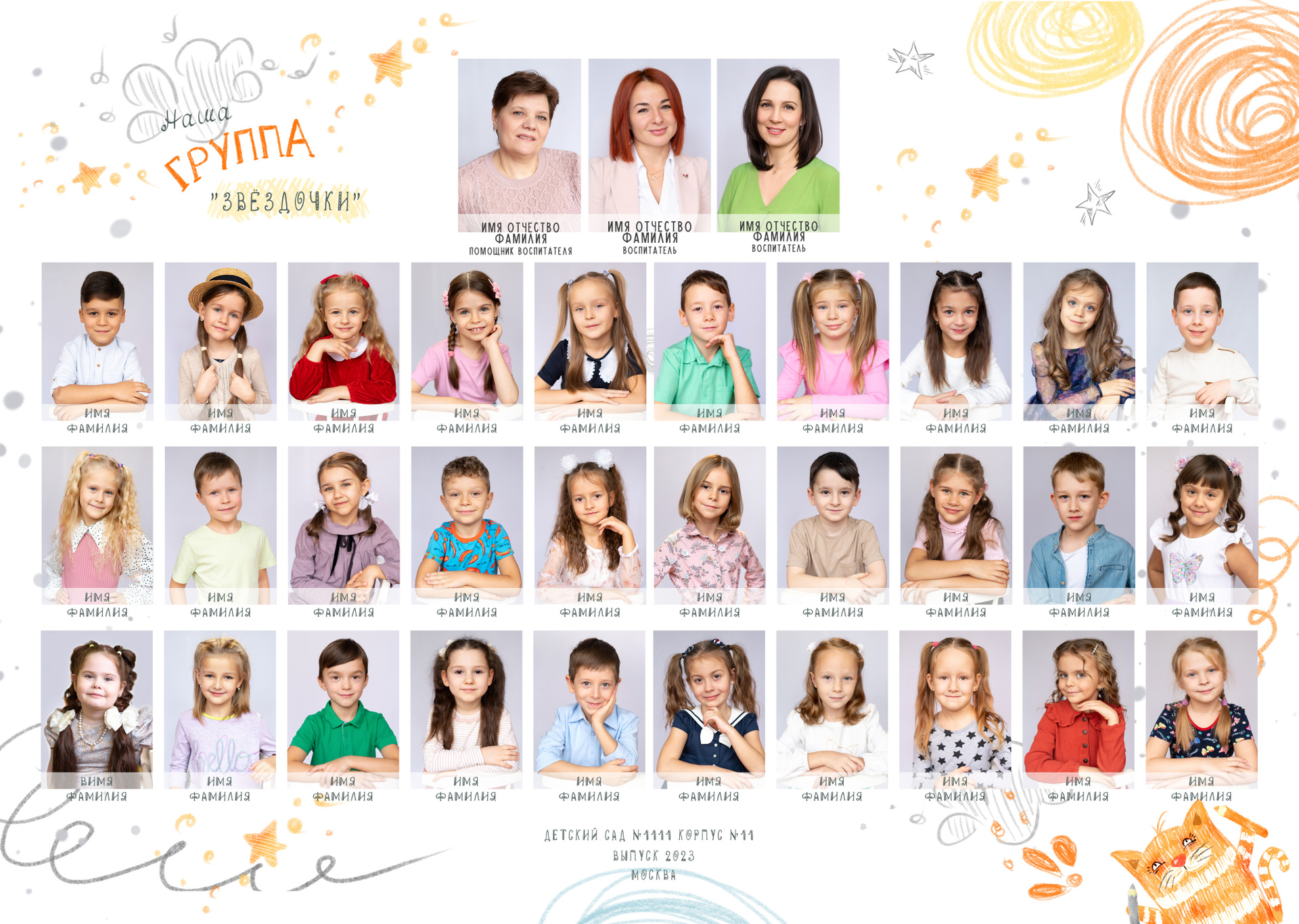 - На развороте виньетка — портреты всех детей группы и педагогов с ФИО